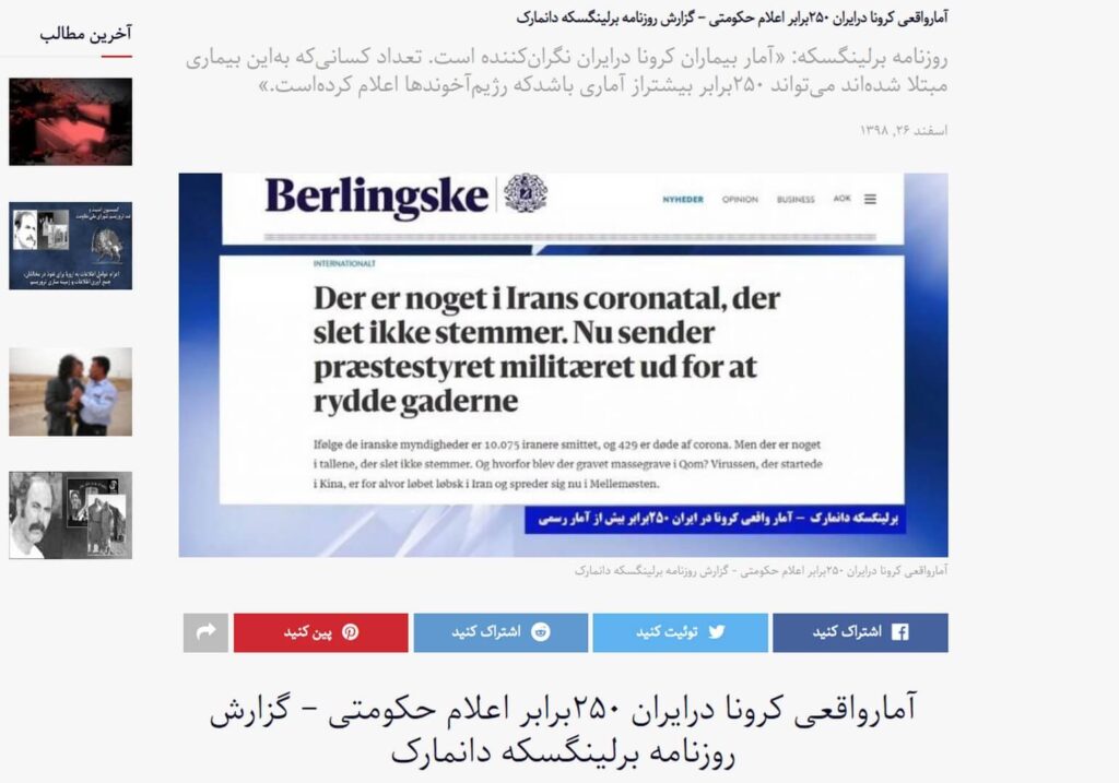 این وب سایت ضد ایرانی که توسط باند رجوی و دیگر رهبران قاتل و آدمکش اداره می گردد، با استناد به یک گزارش جعل شده در یک وب سایت دانمارکی تحت عنوان گزارش روزنامه برلینگسکه دانمارک- مدعی گردید آمارواقعی کرونا درایران ۲۵۰برابر اعلام حکومتی است!